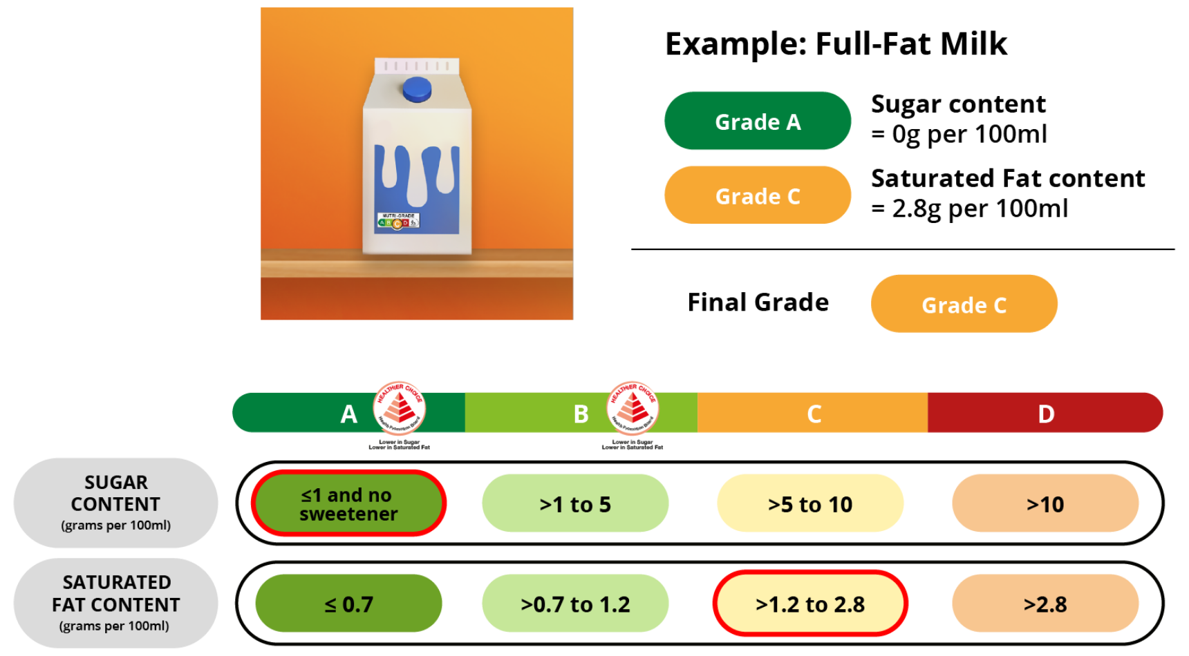 Nutri-Grade is based on both sugar and saturated fat content. Drinks may contain little to no sugar, yet still have high levels of saturated fat. If a drink is graded “B” based on sugar content but “C” based on its saturated fat level, the final grade will take the poorer “C” grade.