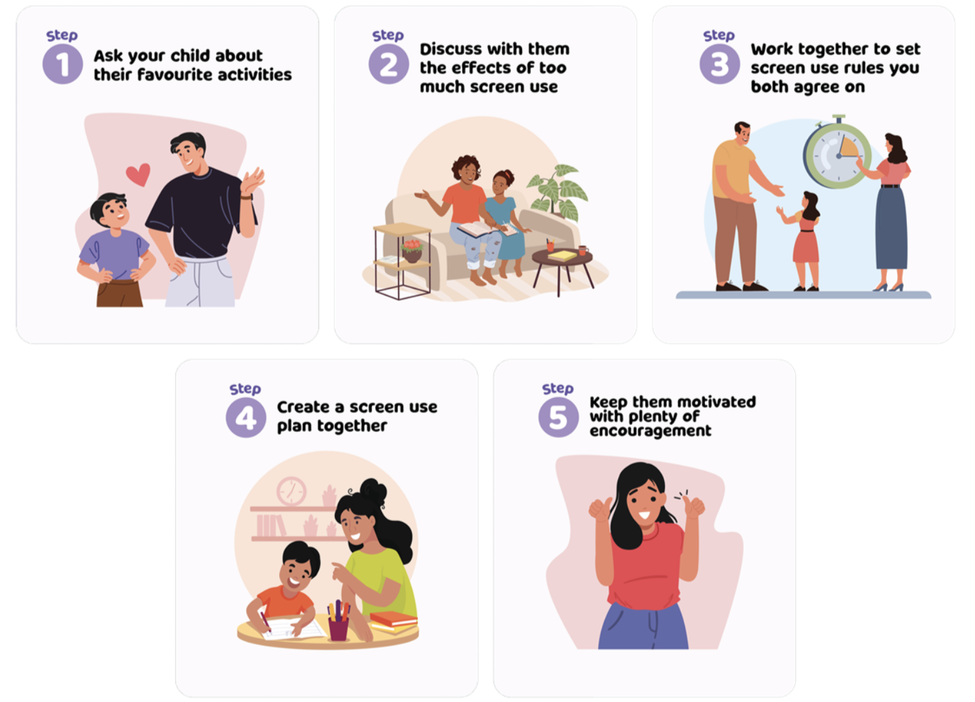 For more information on managing your child’s screen use, you can visit Parent Hub: Sparkly Teeth and Eyes for your 3–6-year-old, and Grow Well SG for your 7–12-year-old.