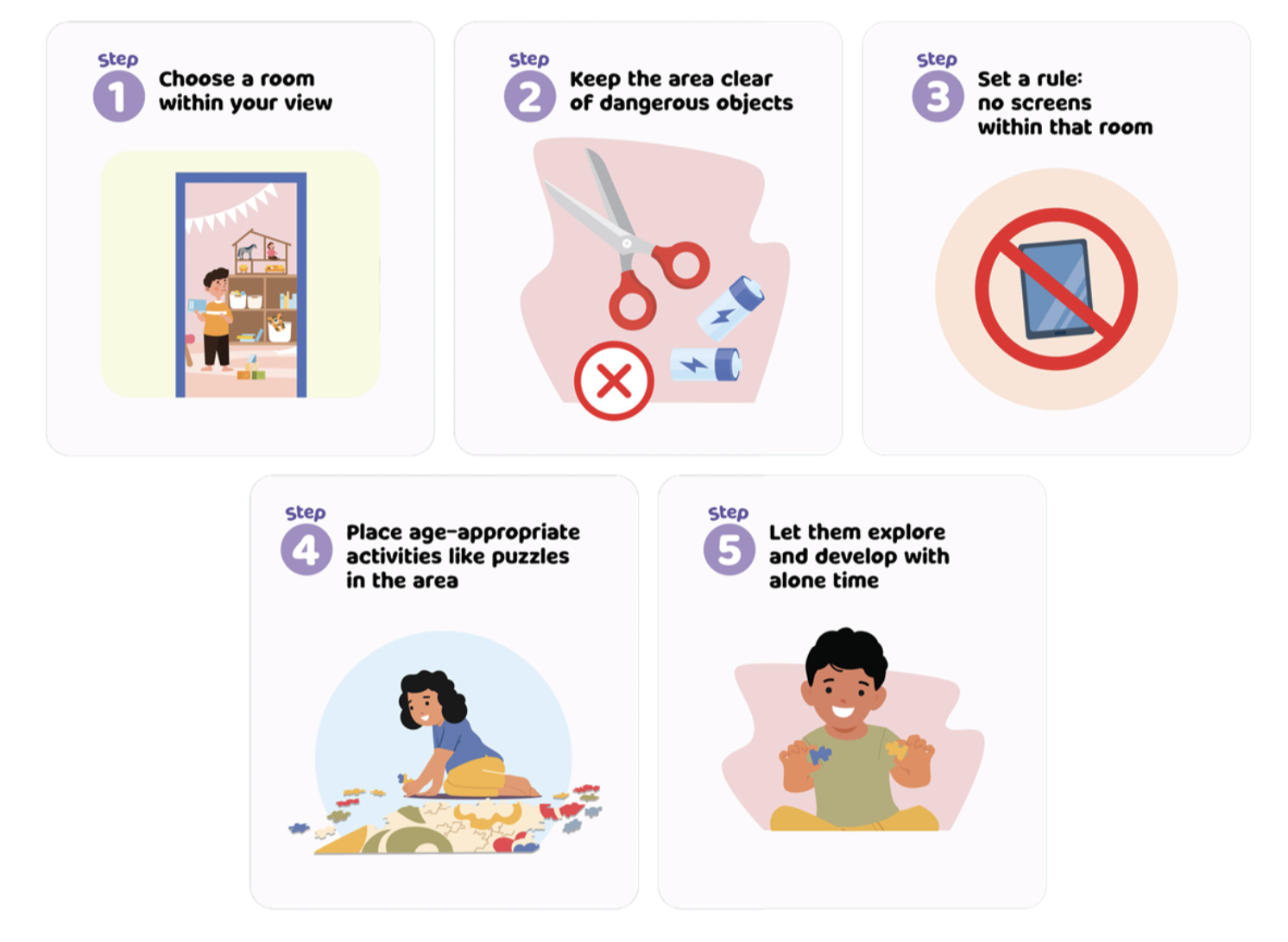 When your child learns how to play by themselves, it can foster patience, persistence, and imagination. Here are some simple steps to help you get your little one started by creating a safe, screen-free play area: